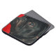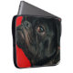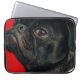 Fotografía fotográfica de un perro de cerdo negro de fondo rojo
