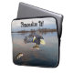 A los aficionados a la pesca, a los amantes de la naturaleza y a los deportes acuáticos les encantará la imagen que tienen los medios de comunicación mixtos de un águila calva estadounidense en vuelo con una gran boca de lubina en sus garras sobre un paisaje de nubes y árboles que reflejan la Creek Broad al atardecer, Camden, NC.