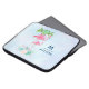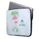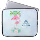 Personalización de la manga de un portátil con un nombre y una inicial. Diseñado con el ilustracion de una mami y un flamenco rosado de bebé sobre una cama de flores suculentas florales con palmeras verdes que se balancean por la espalda. Tropical y bonito. El fondo es una acuarela azul veraniego con toques de violeta.