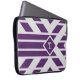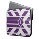 Proteja su computadora con un elegante funda portátil con un llamativo patrón geométrico morado y gris. Parallelogramas y rayas púrpuras apuntan a un diamante púrpura en el tercio derecho de la imagen. El diamante contiene un monograma de personalizable. El fondo es gris claro. Imagen creada digitalmente. Copyright © 2016 Claire E. Skinner. Todos Los Derechos Reservados.