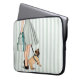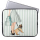 Señora elegante con el perrito lindo elegante del barro amasado de los bolsos de compras que camina en fondo rayado azul. Pintado por el artista Maryline Cazenave.