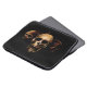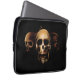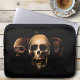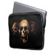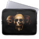 Tres cráneos humanos contra un telón de fondo negro. Una pequeña criatura está mirando por encima del cráneo medio