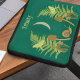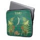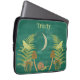 Mis ilustraciones representan un mundo natural con algunos tonos oscuros. Una luna creciente cuelga en el cielo sobre una escena de helechos verdes, polillas amarillas, setas marrones y un caracol verde y marrón, todo ello con un fondo de color verde azulado oscuro pintado. Esta funda portátil está lista para ser personalizada con un nombre u otro texto con letras amarillas.