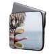 Funda Para Portátil Surfboard rojo y blanco en un rack de madera marró