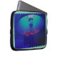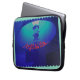 El diseño gráfico de esta funda de portátil de 10" presenta una fotografía original de ZoeSPEAK de una lámpara. Se trata de una vista desde abajo, mirando hacia arriba a la luz y a la bombilla bajo la sombra. La luz está iluminada, lo que da al fondo de la sombra un resplandor de color verde agua en un entorno azul cobalto oscuro. La bombilla tiene un tinte rosado. El texto en rojo dice: "Tengo una idea...". Los bordes superior e inferior del diseño tienen agujeros a lo largo de ellos, que parecen un poco los bordes de una tira de película de 35 mm. El fondo más allá de los bordes de diseño es blanco.