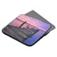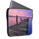Un embarcadero de madera en un lago, mientras que la puesta del sol crea un cielo rosado.