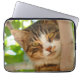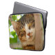 Foto retrato de un gato con ojos verdes y claros trepando un árbol en un día soleado.