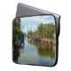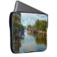 Manténgase fresco con la vista tranquila y tranquila de esta funda de portátil de 15". Esta fotografía original de ZoeSPEAK es una larga vista de un canal en la Isla Estero, Florida. Al fondo de la vía fluvial, cerca del horizonte, se encuentra el puente que conduce al continente. El cielo azul está lleno de nubes blancas acolchadas, árboles tropicales y barcos que bordean el canal, y un reflejo de la bella escena completa esta imagen de la vida costera.