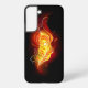 Una brillante pluma de pavo real hecha de fuego y llama sobre fondo negro.