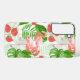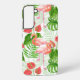 Diseño acuático con flores y pájaros flamencos, monstera y hojas de palma.
