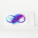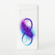 Infinity symbol with a beautiful feather painted in purple and blue bright colors on white background.