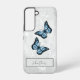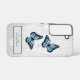 Carga tu equipo electrónico con un Funda Samsung Galaxy Brilliant Blue Butterflies. El diseño funda presenta unas mariposas brillantes que descansan sobre una vid floral blanca sobre un fondo gris.