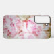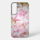 Este patrón trenzado de diseño floral, florece brillante, en flores tipo peón, de rosa y blanco, con hojas verdes resaltadas, en colores de oliva y marrón.