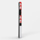 Funda de iPhone 5, elegante y lindo, diseñado en un patrón de galas rojas y blancas, con un adorable pingüino negro redondeado, y personalizado impreso con tu nombre o texto personalizado.