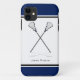 Este Funda iPhone 5/5S presenta un par de palos lacrosse cruzados en la parte delantera y trasera del funda. Bandas negras, blancas y azules están en la parte superior e inferior. Personalice con su nombre y mensaje. Contáctenos si desea una combinación de colores diferente.