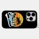 Estuche para iPhone de California con un diseño retro que cuenta con una puesta de sol y palmeras sobre fondo negro (personalizable bg). Este diseño también tiene a California en un tipo de letra manuscrita con un glifo de cruz para ese elegante estilo retro. Este estuche para iPhone es sólo para ti si eres de California o puedes conseguirlo como regalo o recuerdo para alguien.