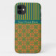 Un Funda de moda-funda de mate a personalizar para tu iPhone 5/5s, con un patrón de flores verdes estilizadas, delineado en Azul marino, en un fondo rojo rizado, unido con un patrón a rayas coincidentes. Parte de la colección "Tambores de la jungla" de Pintorly y Pintorly.