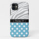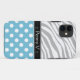 Funda elegante y ondulado para iPhone 5 diseñado con un patrón de rayas de cebra gris y blanco, puntos de polka blanco sobre azul y personalizado con tu nombre o texto personalizado en blanco sobre negro.
