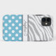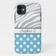 funda personalizado para iPhone 5 personalizado con su nombre, y diseñado con un patrón de puntos polka azul y blanco y un patrón de impresión de cebra con rayas de cebra grises y blancas.