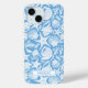 Personaliza esta funda para iPhone 15 con el patrón de concha azul con tu nombre en una fuente mayúscula moderna y trendy en azul sobre blanco. ¡Es muy moderna y playera!