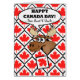 Un alce gracioso atraviesa un muro de azulejos de hojas de arce en la cubierta de esta tarjeta de felicitación del Día de Canadá. ¡Feliz Día de Canadá! Querida tía y tío, texto en la portada. Diseño contemporáneo audaz en rojo, blanco, negro y marrón. Arte, imagen y verso copyright © Shoaff Ballanger Studios.