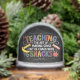 This playful chalkboard-style design features bold, colorful text that reads: “Teaching: The Art of Making Sense Out of Chaos With Snacks,” accented by a banana, apple, ruler, and chalk. The back reads, “Best Teacher Ever” in the same fun style. Perfect for educators with a great sense of humor.