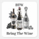 Añade un toque de humor a tus pertenencias con este divertido pegatina. Presenta tres botellas de vino de estilo elegante y de estilos diferentes, acompañadas por la frase lúdica "BTW: Bring The Wine". Ideal para los amantes del vino para decorar laptops, botellas de agua, cuadernos o regalos a los amantes del vino.