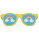 Lindas gafas de sol de verano con un arco iris rosado contra el cielo azul. Disponible en alegres colores amarillos y otros colores vivos para el fiesta de la piscina. Imagen de www.prettygrafik.com