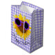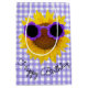 Girasol amarillo con gafas de sol de polika púrpura sobre fondo de gingham morado y blanco.