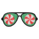 Las gafas de sol de los Navidades de la novedad tienen grandes caramelos de menta roja contra un fondo verde. Esto sería una divertida adición a una fiesta de Navidades y un gran accesorio para suéter fea.