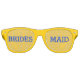 Gafas de fiesta amarillas de la dama de honor con el lente hecho en amarillo, con lectura de texto personalizado azul, BRIDES MAID. Ideal para la fiesta de la soltera.