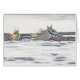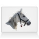 Un caballo blanco y animado galopando en un pastizal nevado.