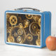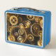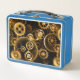 Sin soldadura, metalizado, latón, engranajes dorados sobre un fondo oscuro y oxidado. Estilo Steampunk.