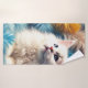 Esta toalla de baño tiene un lindo gatito blanco.