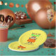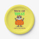 Platos de fiesta de Halloween con fondo amarillo, gatito dentro de calabaza, truco o regalo, feliz halloween