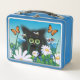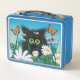 Adorable arte digital de un gatito negro con enormes ojos verdes sentado en un jardín de margaritas, mariposas y abejas.