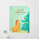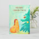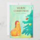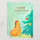 Acuarela divertida. Tarjeta navideña con un gato gordo sentado frente a un árbol de Navidad y con un gorra de Papá Noel. Tarjeta de Navidades perfecta para cualquier amante del gato.