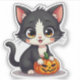 Ilustración encantadora de un gatito kawaii en blanco y negro con tema de Halloween, perfecta para scrapbooking, planificadores y decoraciones espeluznantes.