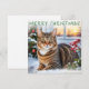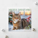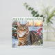 Esta tarjeta festiva de Navidad presenta una imagen de un lindo gato atigrado sentado fuera de su casa en una tarde nevada, con plantas y bayas de invierno. Con el saludo 'Feliz Navidad' en la parte superior, la tarjeta es blanca lisa en el reverso para su propio mensaje.