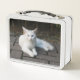 Esta caja de almuerzo tiene un gato blanco retratado en ella.