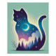 Entrar en un mundo mágico con este poster único de doble exposición de gato celeste. Este encantador diseño combina la elegante silueta de un gato con un paisaje nocturno de ensueño, con una luna creciente brillante, estrellas brillantes y un bosque sereno bañado en tonos suaves y vibrantes. Una mezcla perfecta de fantasía y estilo moderno, lo que lo convierte en un lugar imprescindible para los amantes del gato y del arte por igual.