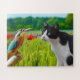 Rompecabezas del juego mostrado con una foto impresa de un gato realmente interesado en el pájaro colorido de la cerca. Personalizar este artículo o compra tal cual. Imagen de stock