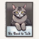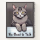Revista en un ilustracion de un gato grisáceo de aspecto severo con ojos penetrantes amarillos posando sus patas delanteras sobre una cornisa, mirando directamente hacia delante con un aire de autoridad seria. Debajo del gato, el guión en negrita dice "Necesitamos hablar", agregando humor y drama.