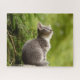 Rompecabezas con la imagen de un gato sentado junto a un árbol con árboles verdes desdibujados en el fondo.