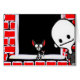 Un gato negro personalizado sentado en la cornisa de un ventanal, sosteniendo un ratón personalizado, mientras un niño con una cabeza grande se inclina para colarse en la foto. La nieve cubre los ladrillos rojos y la cornisa de la ventana de este bonito dibujo en blanco, negro y rojo.