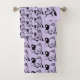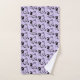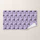 Una toalla con estampado diseñada con el ilustracion de un gatito sonriente y ondeando con un manto negro alrededor de la oreja. Fondo morado. Simple lindo y adorable.