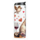 Este ilustracion humorístico cuenta con un gato gruñón y rayado que abraza una gran botella de vino y un gran corazón rojo. El gato tiene una expresión descontenta. Una copa de vino se sienta en la mesa, y dos pájaros enfurecidos vuelan al fondo, creando una divertida y sarcástica posición sobre el El día de San Valentín.
