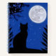 Diario en la silueta de un gato, contemplando una luna llena en un cielo estrellado azul profundo