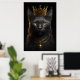 Gato negro con corona - arte de pared Poster - Un gato negro con ojos dorados usando una pequeña corona dorada contra un fondo negro. Una obra de arte de IA generativa