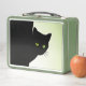 El gato negro pálido con ojos verde esmeralda mira desde detrás de la pared negra hacia una sala verde.